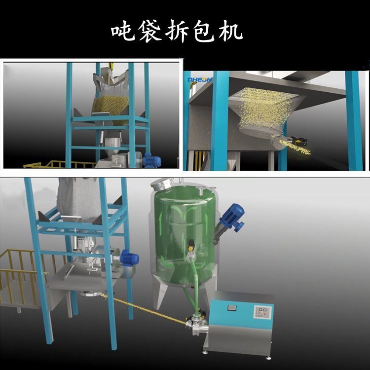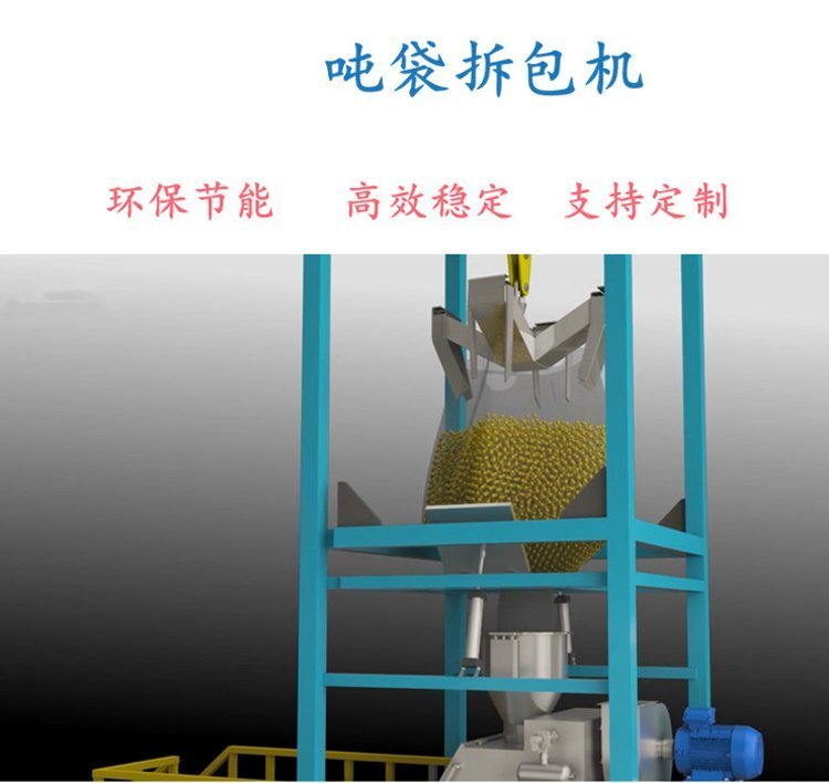 噸袋拆包機(jī)用來(lái)實(shí)現(xiàn)袋裝散裝物料的卸料功能,為半自動(dòng)操作。將噸包中的原料高效、環(huán)保、節(jié)省人工的卸放到客戶指定設(shè)備中的設(shè)備。傳統(tǒng)的噸包到料方式是直接解開(kāi)或者劃開(kāi)噸包,將物料直接傾倒至客戶設(shè)備進(jìn)料口,造成粉塵大面積分散,對(duì)環(huán)境及操作人員都存在危害,碰到有易爆的原料,如淀粉、面粉等,會(huì)增加粉塵爆炸的可能性。噸袋開(kāi)袋機(jī)解決了這一問(wèn)題。我們根據(jù)用戶使用的噸包尺寸、類(lèi)型、現(xiàn)場(chǎng)工況,為客戶選擇所需拆包機(jī)的型號(hào)。